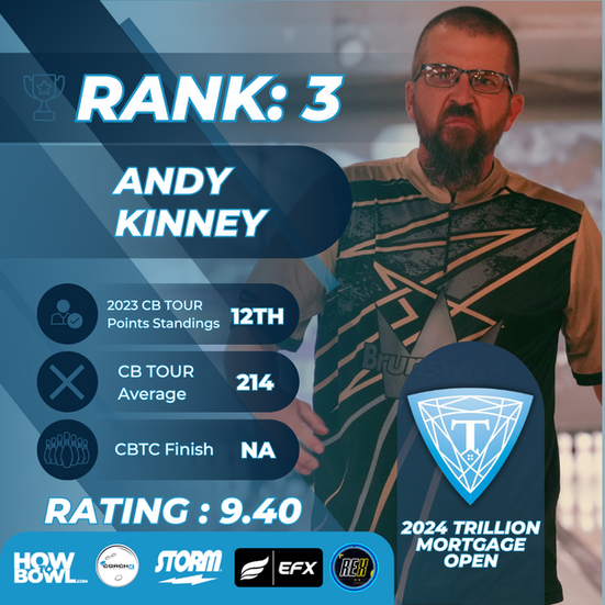 3. Andy Kinney - Andy Kinney is looking to keep the momentum rolling after breaking out a few wins a couple of seasons ago. Last I saw him, he made the step ladder at the Railroader and took Alex Hoskins 4 rounds in a roll-off in the quarter-finals last year in the RIGC. Andy bowls well in this center, and his ball roll should be great on this pattern. Just under Chase and Manny is Andy on getting a win this year on the CB TOUR. The format is drastically different than what most are used to out here, and it takes a second to get used to the pressure you constantly feel on the CB TOUR. Andy will not be a name you want to see on your side of the bracket this weekend.